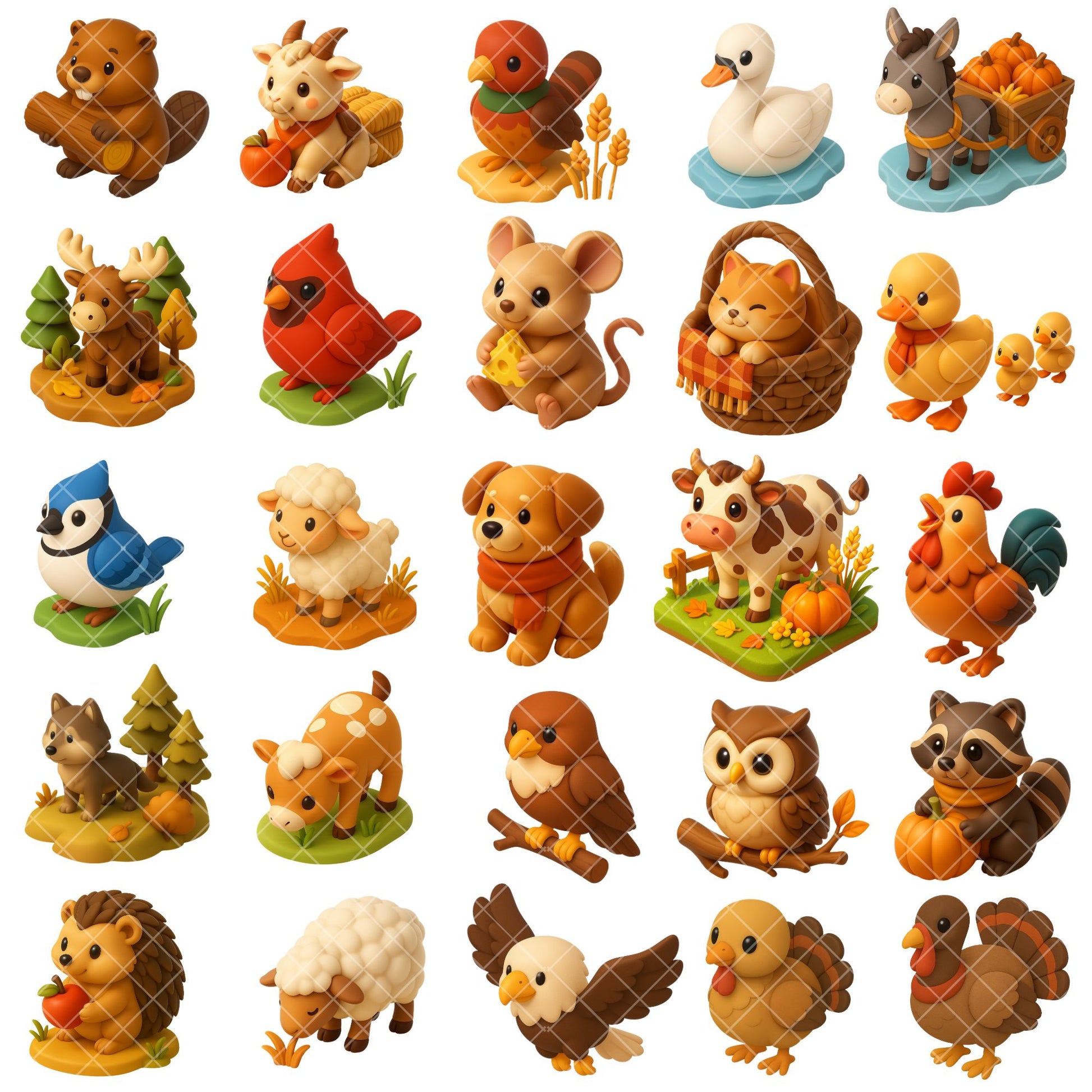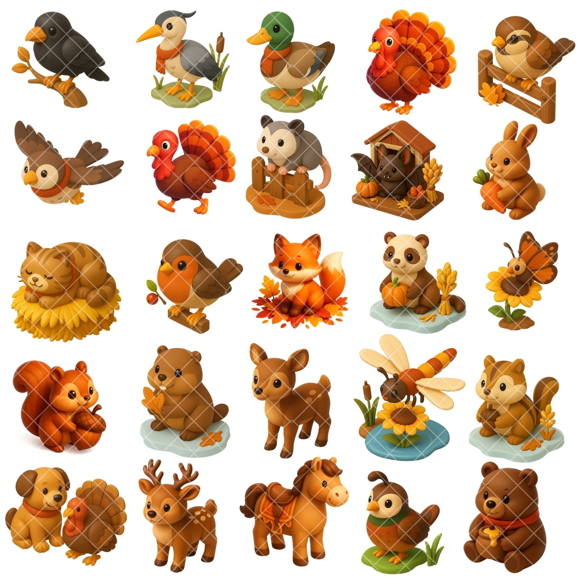 Thanksgiving Animal Clipart, Autumn Harvest PNG Bundle, Cute Fall Animals Pumpkins Leaves, Cozy 3D Art (56 PNG)